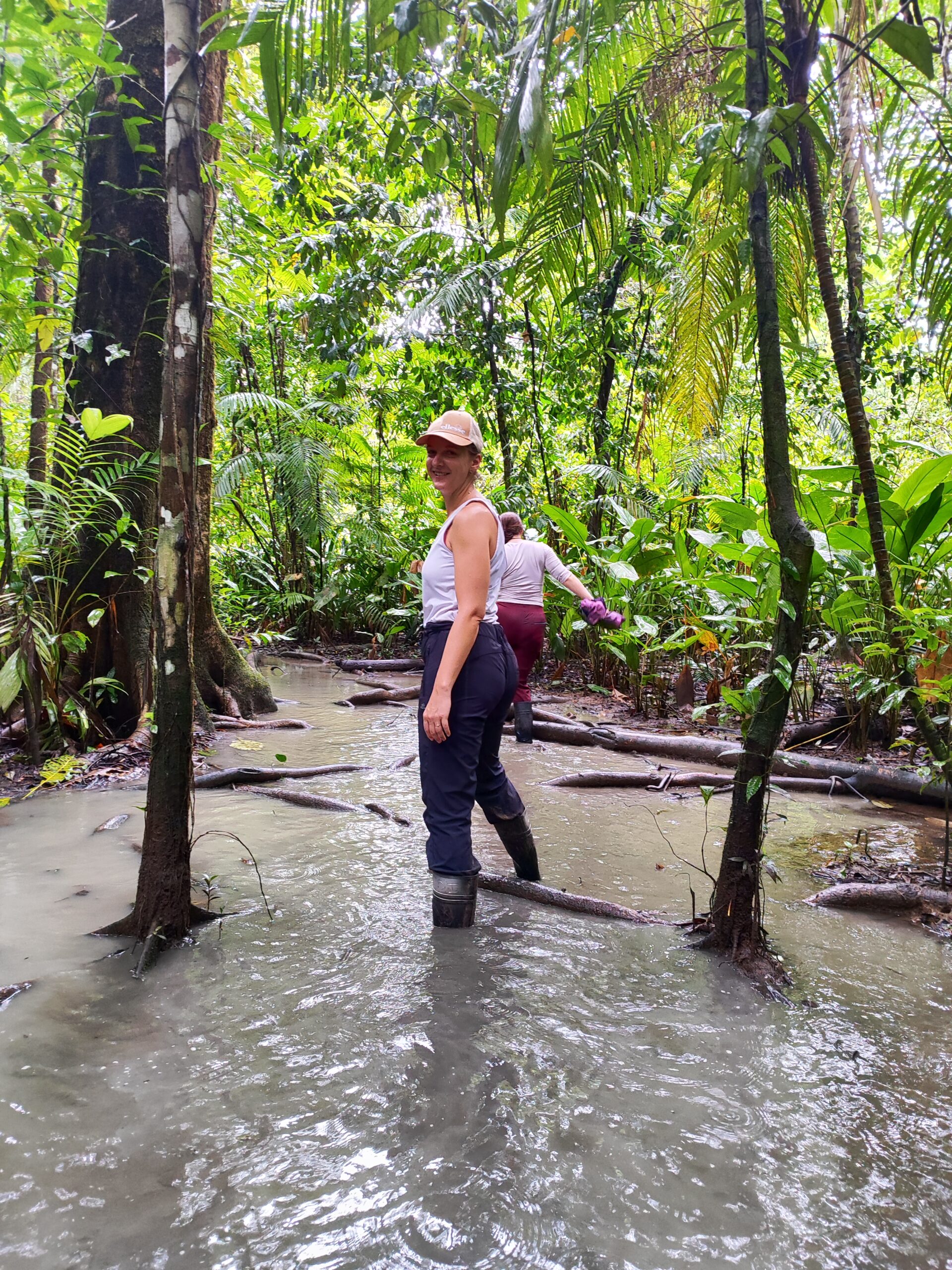 In der Nacht regnete es wie aus Eimern und um fünf Uhr morgens starteten wir zur nächsten Wanderung. Zum Glück lieh uns die Station Gummistiefel aus, denn die Wege waren komplett matschig. Ausgerüstet mit Regenjacke und Stiefeln stapften wir los. An diesem Tag bekamen wir zwar weniger Tiere zu Gesicht, doch die Stimmung im Regenwald war trotzdem wunderschön.