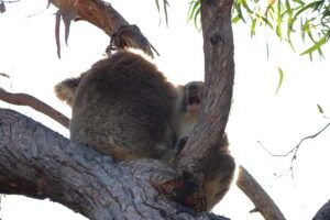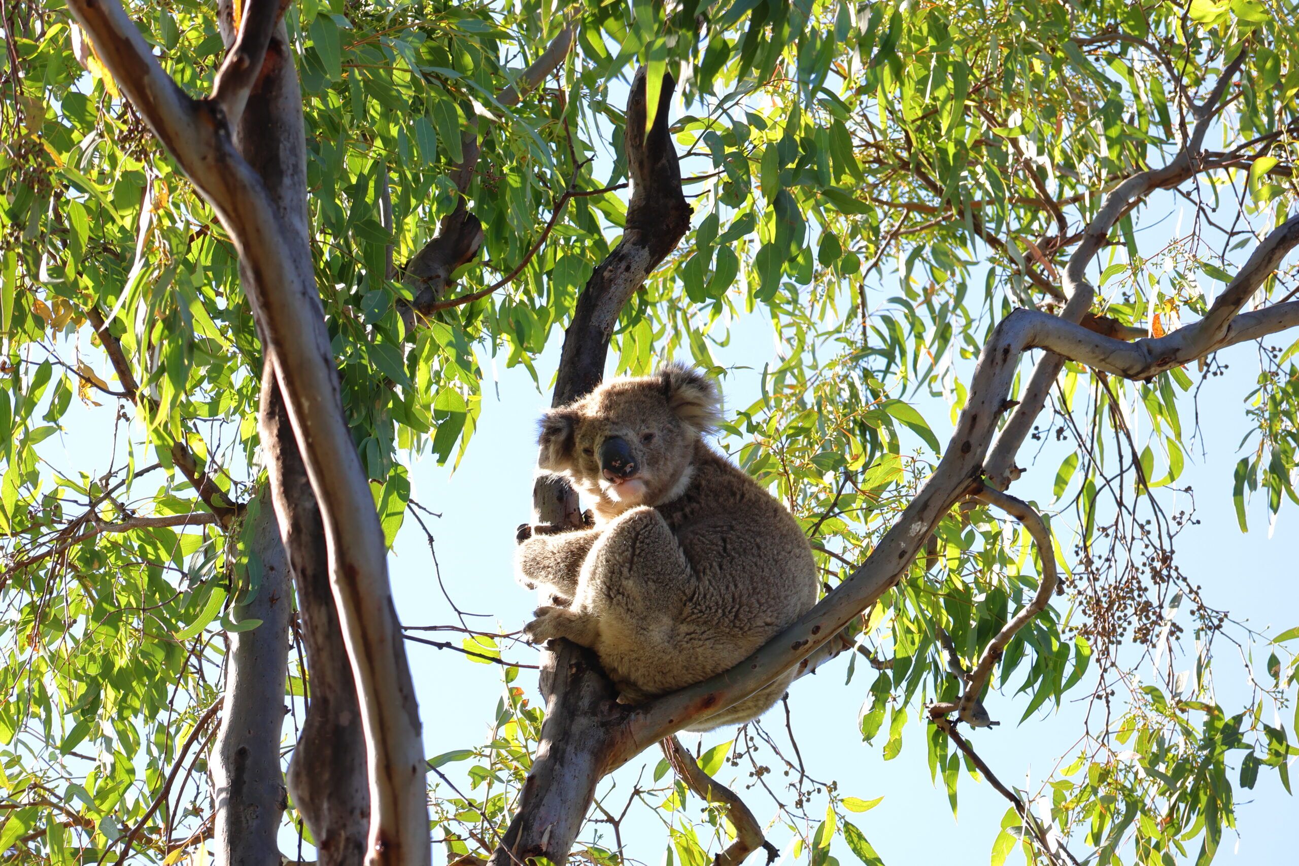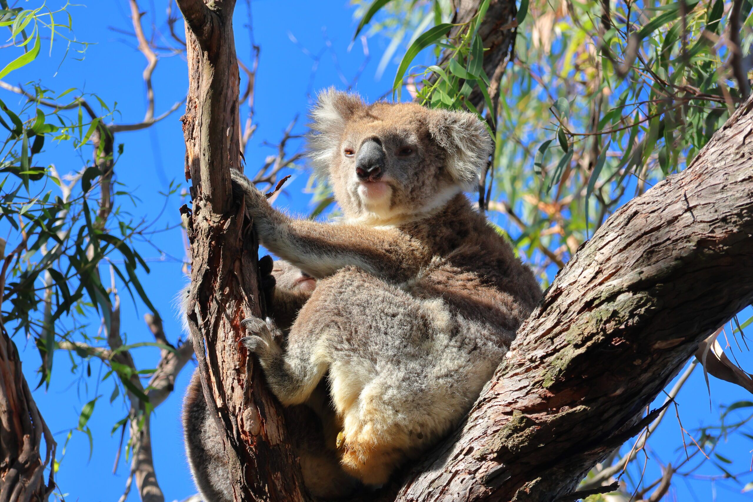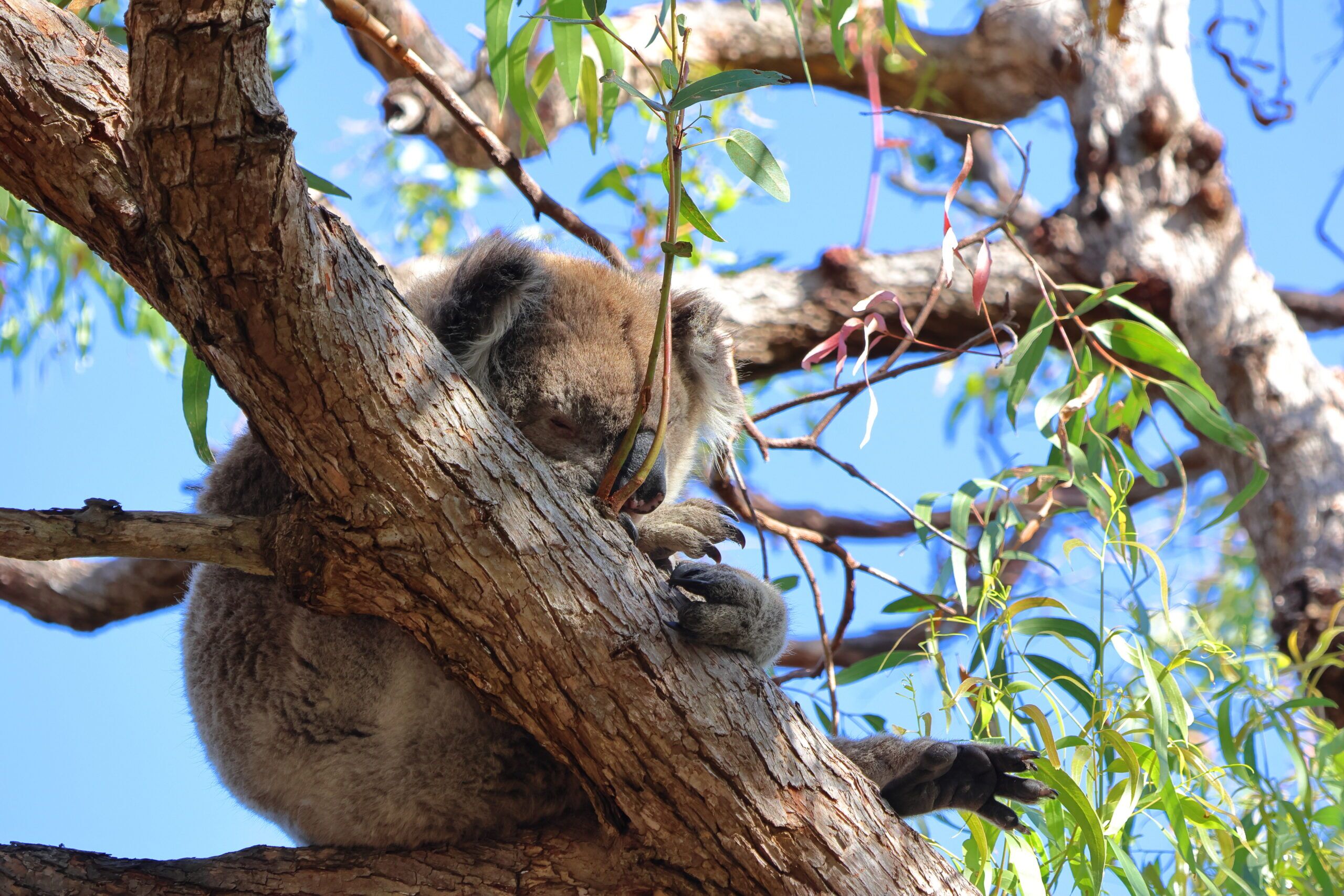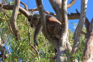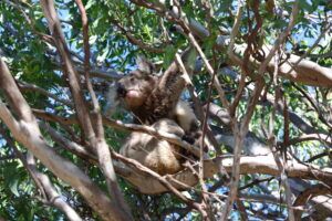 Am Anfang war noch nichts zu sehen und wir scherzten schon darüber, dass wir uns am Ende des Spaziergangs wahrscheinlich eine ordentliche Nackenstarre eingefangen hätten – bis wir plötzlich unseren ersten Koala entdeckten. Wie eine kleine graue Kugel zusammengerollt saß er hoch oben in einer Astgabel und schlief tief und fest. Ein paar Meter weiter dann der nächste… und noch einer… und noch einer. Es fühlte sich fast surreal an. Raymond Island ist tatsächlich bekannt für seine hohe Koala-Dichte, weil die Tiere hier in Ruhe in den Eukalyptusbäumen leben können. Manche der Koalas waren aktiv, knabberten gemütlich Blätter oder streckten sich genüsslich in der Nachmittagssonne. Kurz vor Ende unseres Rundgangs entdeckten wir sogar eine Mutter mit ihrem Nachwuchs – schon ziemlich groß, aber trotzdem noch eng an sie gekuschelt. Am Ende hatten wir unglaubliche 19 Koalas gezählt. Was für ein perfekter erster Spaziergang!