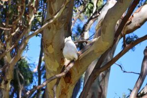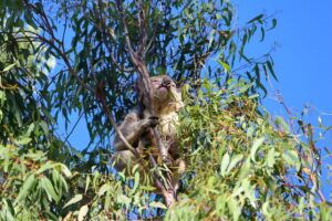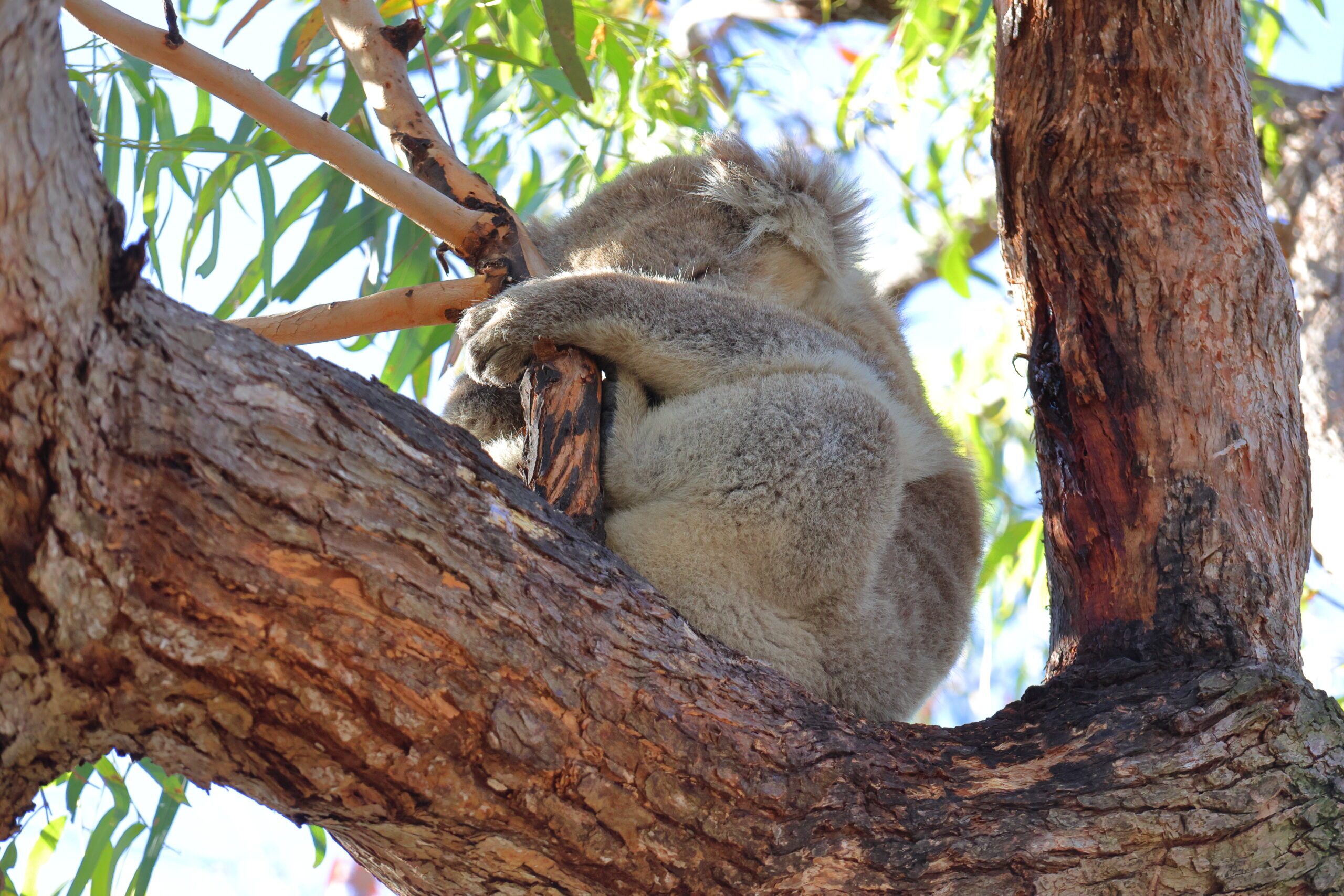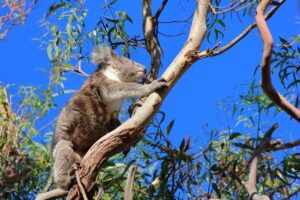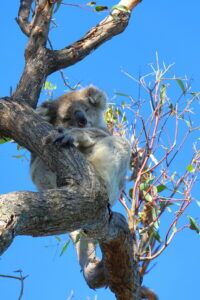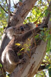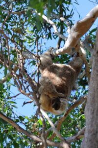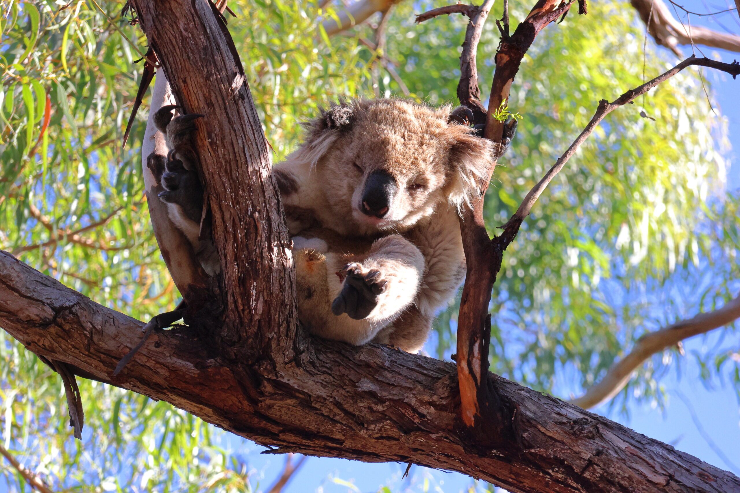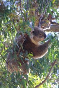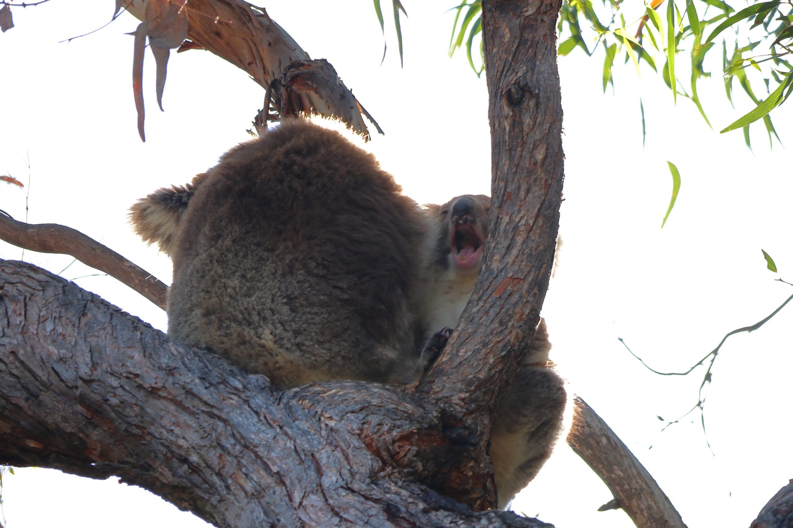 Am Anfang war noch nichts zu sehen und wir scherzten schon darüber, dass wir uns am Ende des Spaziergangs wahrscheinlich eine ordentliche Nackenstarre eingefangen hätten – bis wir plötzlich unseren ersten Koala entdeckten. Wie eine kleine graue Kugel zusammengerollt saß er hoch oben in einer Astgabel und schlief tief und fest. Ein paar Meter weiter dann der nächste… und noch einer… und noch einer. Es fühlte sich fast surreal an. Raymond Island ist tatsächlich bekannt für seine hohe Koala-Dichte, weil die Tiere hier in Ruhe in den Eukalyptusbäumen leben können. Manche der Koalas waren aktiv, knabberten gemütlich Blätter oder streckten sich genüsslich in der Nachmittagssonne. Kurz vor Ende unseres Rundgangs entdeckten wir sogar eine Mutter mit ihrem Nachwuchs – schon ziemlich groß, aber trotzdem noch eng an sie gekuschelt. Am Ende hatten wir unglaubliche 19 Koalas gezählt. Was für ein perfekter erster Spaziergang!
