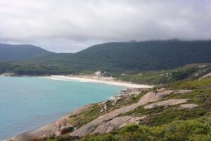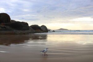 Danach zog es uns zur Whisky Bay. Und wow – dieser Strand. Türkisblaues Wasser, riesige runde Granitfelsen, weißer Sand und dahinter sattgrüner Wald. Die Buchten hier wirken fast gemalt, als hätte jemand die Farben ein kleines bisschen zu intensiv eingestellt. Wir wanderten erst zu einem Aussichtspunkt oberhalb der Bucht und anschließend hinunter zum Strand. Der Wind, das Rauschen der Wellen und diese Weite – Wilsons Prom hat sofort etwas Wildes und Ursprüngliches.