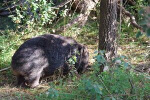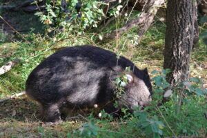 Ein rundes, dickes Wombat-Gesicht tauchte tatsächlich im Eingang der Erdhöhle auf. Erst nur die Nase. Dann die kleinen Augen. Und schließlich kam es langsam komplett heraus. Carina reagierte blitzschnell und zückte die Kamera. Wir standen einfach nur da und konnten unser Glück kaum fassen. Das Wombat trottete gemächlich an uns vorbei, völlig unbeeindruckt, und verschwand nach ein paar Metern schließlich im Gebüsch.