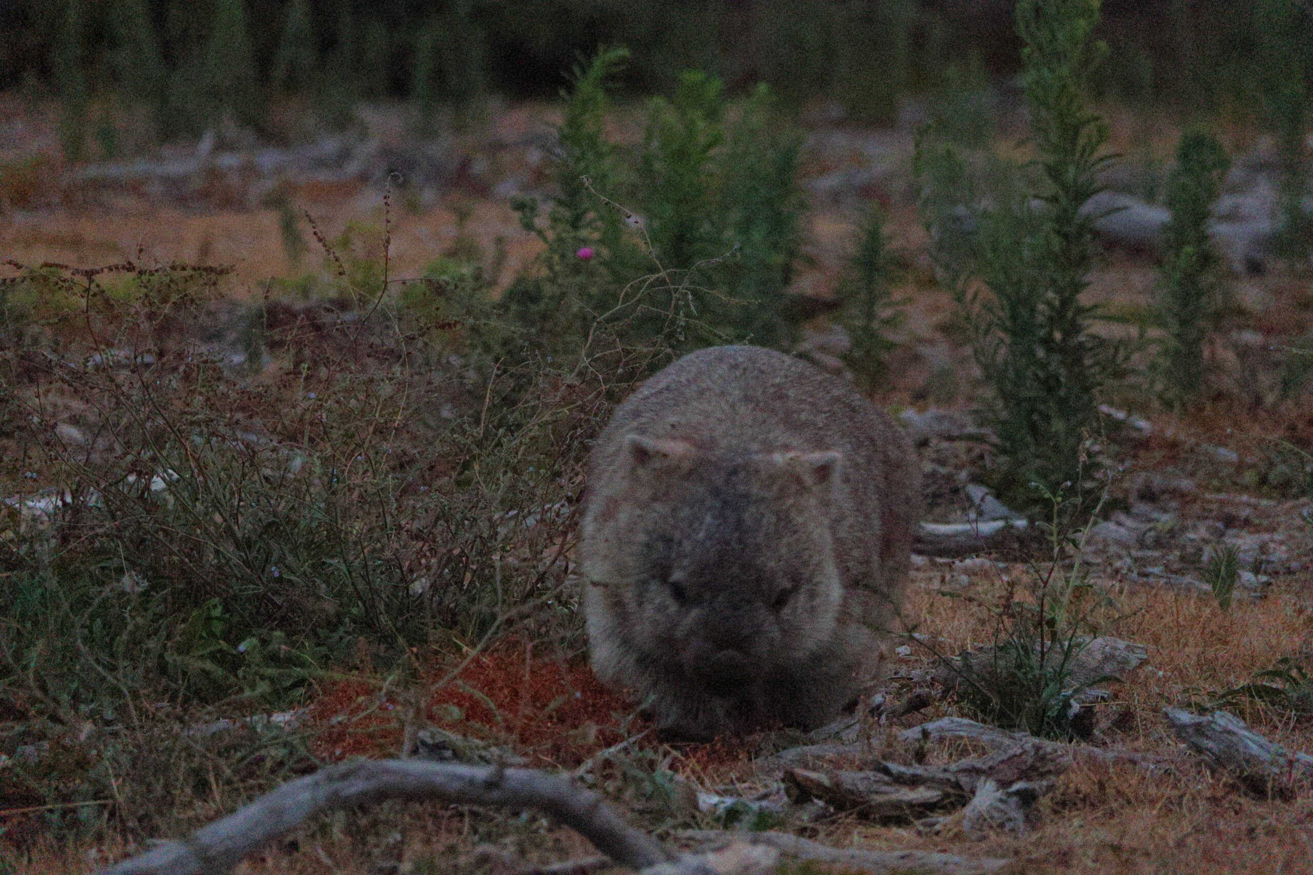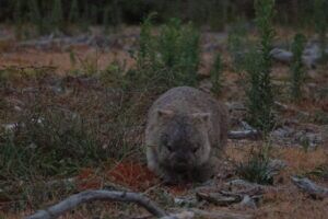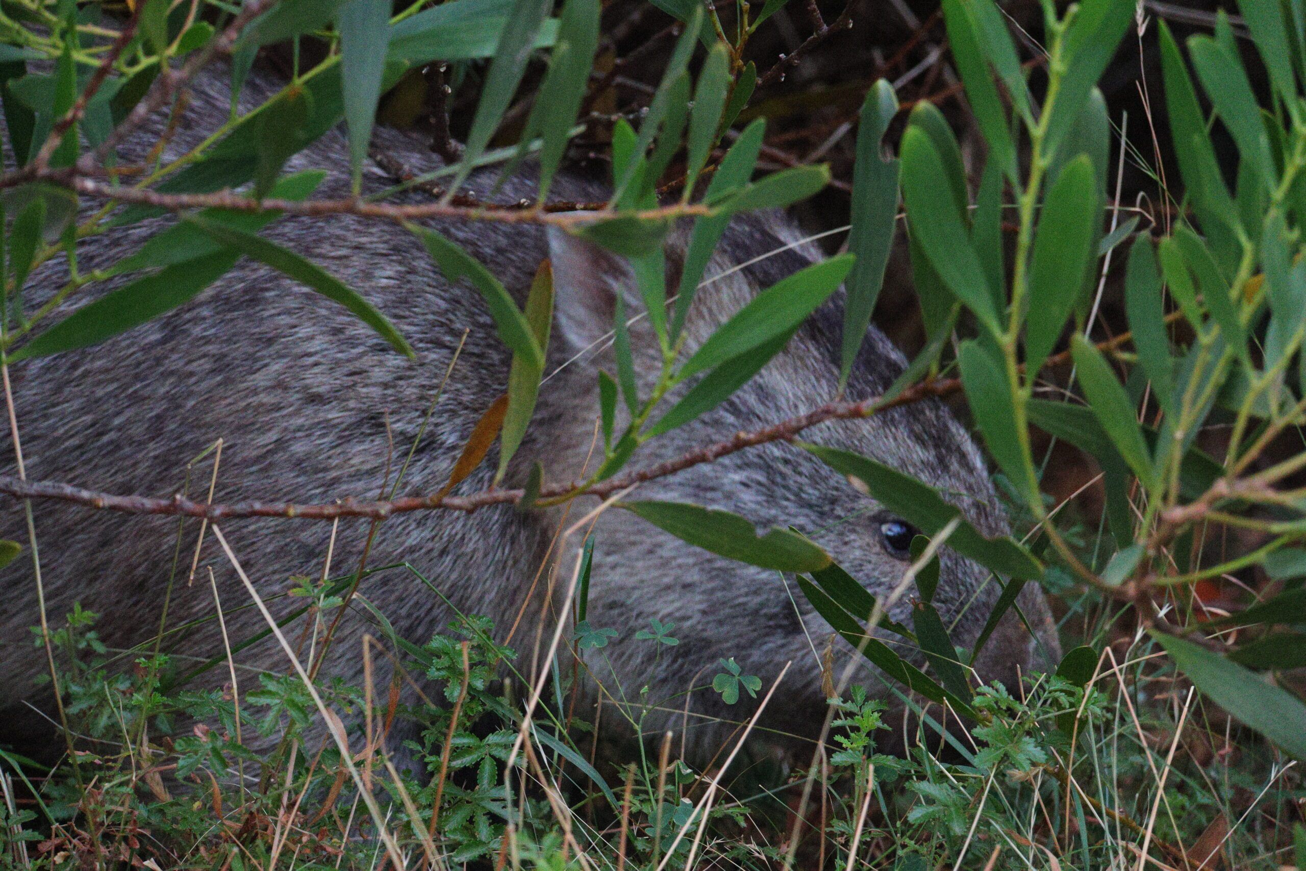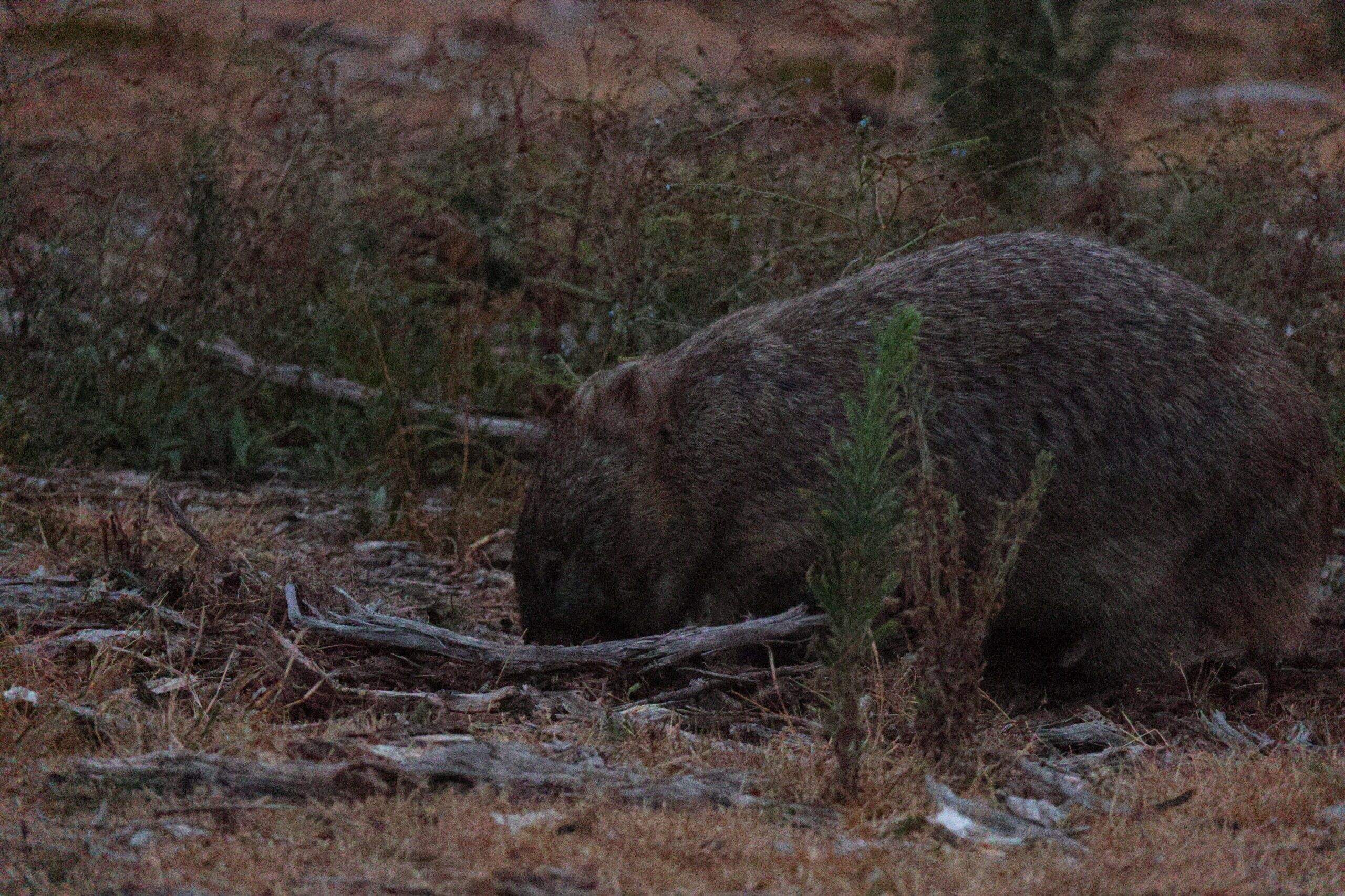 Auf dem restlichen Rundweg sahen wir noch drei weitere Wombats: eines kurz im Gebüsch, eines weiter entfernt auf einer offenen Grasfläche und ein letztes fast am Parkplatz, als es schon richtig dunkel wurde. Zusammen mit dem Wombat vom Strand also insgesamt fünf an einem Tag.