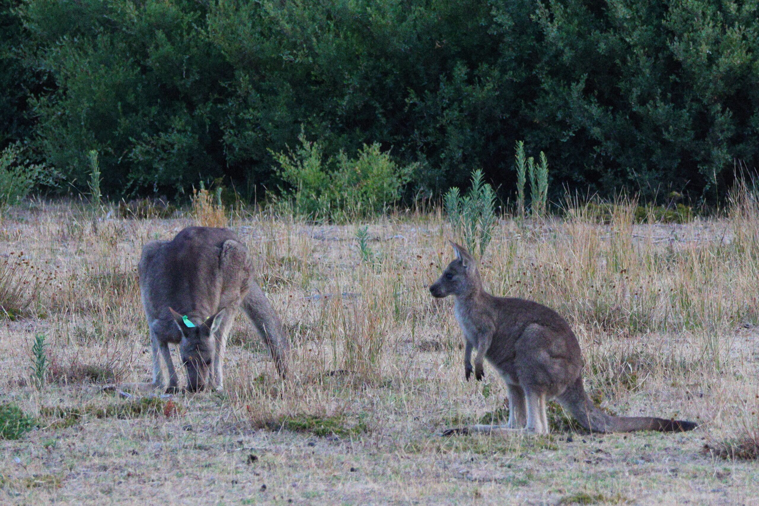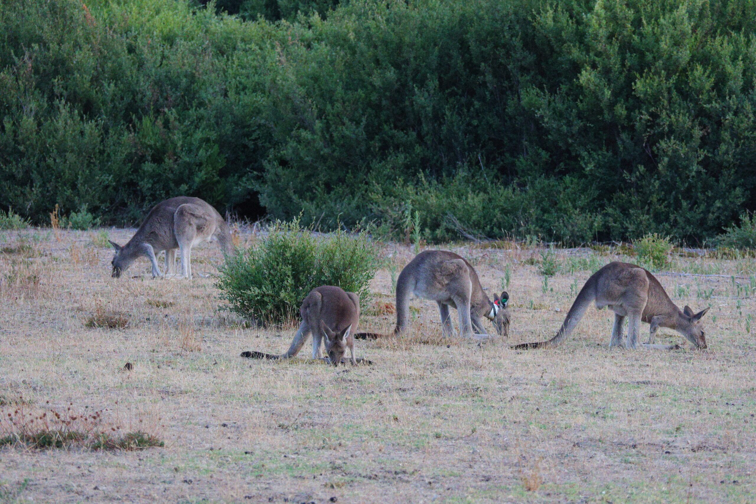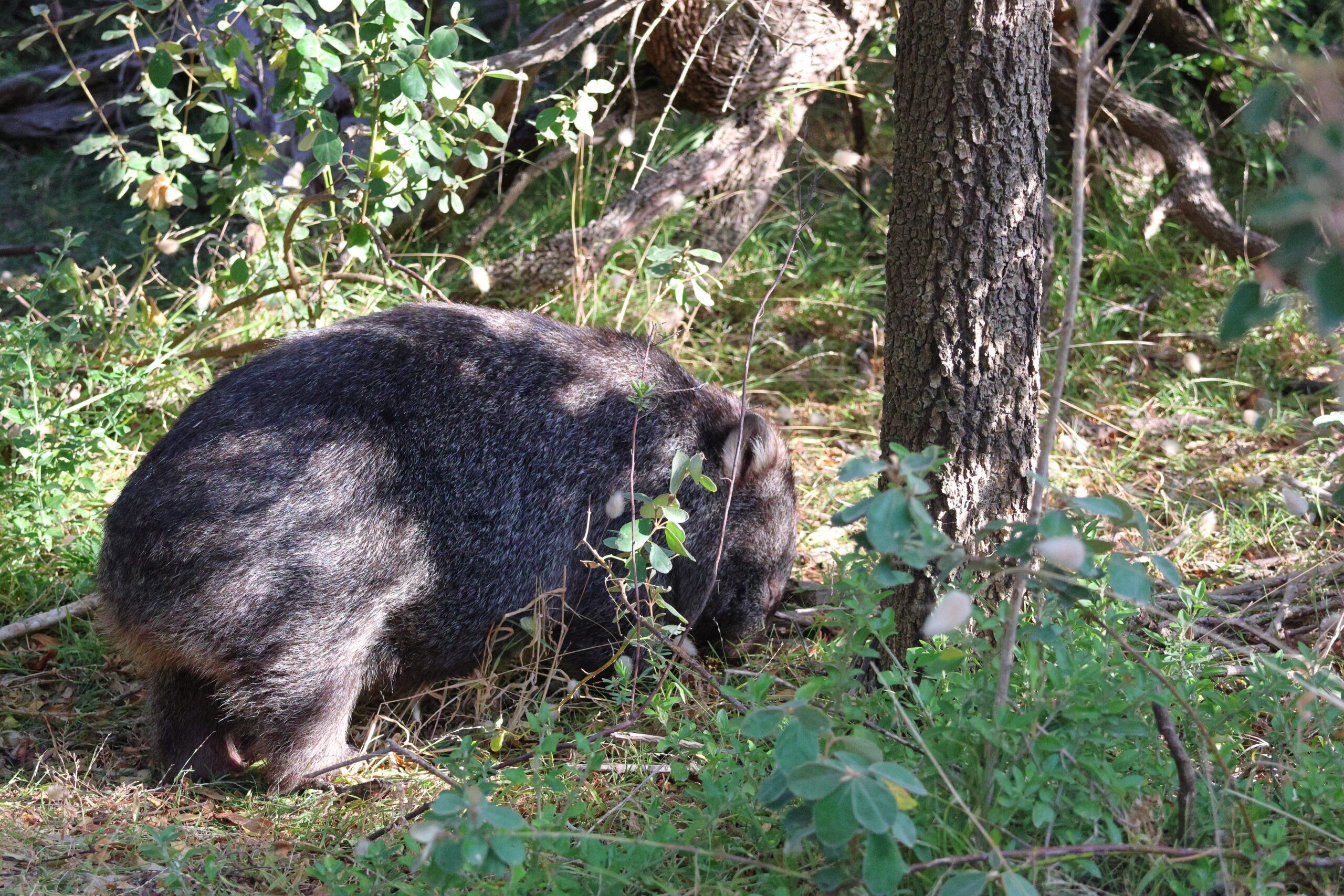 Auf dem restlichen Rundweg sahen wir noch drei weitere Wombats: eines kurz im Gebüsch, eines weiter entfernt auf einer offenen Grasfläche und ein letztes fast am Parkplatz, als es schon richtig dunkel wurde. Zusammen mit dem Wombat vom Strand also insgesamt fünf an einem Tag.