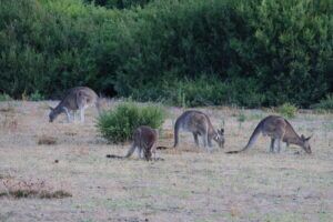 Und dann kam unser finaler Versuch auf dem Wildlife Walk. Schon zu Beginn graste eine größere Gruppe Kängurus auf der offenen Fläche, dazwischen vereinzelte Wallabys. Wir gingen weiter, vorbei an einer Wombat-Höhle, und sagten noch halb im Spaß: „Wie verrückt wäre es, wenn jetzt genau hier ein Wombat rauskommt.“