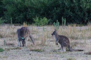Danach liefen wir noch ein Stück am Strand entlang und hinter den Dünen zurück – aber kein weiteres Wombat wollte sich zeigen. Also holten wir unser vorbereitetes Abendbrot aus dem Auto und machten es uns auf einer Parkbank gemütlich. In der Abenddämmerung wurde es plötzlich laut in den Bäumen. Schwärme von Vögeln sammelten sich, besonders die rosafarbenen Galahs (Rosakakadus) und die weißen Corellas. Ein wildes Kreischen, Flattern, Durcheinander – als würde der Tag mit einem letzten Spektakel verabschiedet werden.