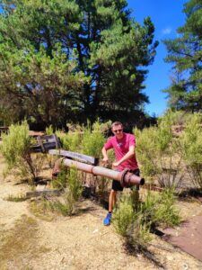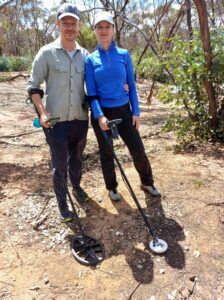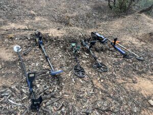 Shane erklärte uns zunächst die Metalldetektoren. Goldsuche mit dem Detektor nennt man hier „Prospecting“. Und das ist wirklich eine Wissenschaft für sich. Es gibt Geräte für unterschiedliche Tiefen, für kleine Partikel nahe der Oberfläche oder größere Objekte in der Tiefe. Vor Beginn wird der Detektor auf die Bodenmineralisierung kalibriert – denn das stark eisenhaltige Gestein in Victoria kann sonst für Fehlalarme sorgen. Am Ton oder über das Display lässt sich theoretisch erkennen, ob es sich eher um Eisen, Aluminium oder etwas anderes handeln könnte. Aber Shane meinte, bis man ein Gerät wirklich „lesen“ kann, dauert es Monate.