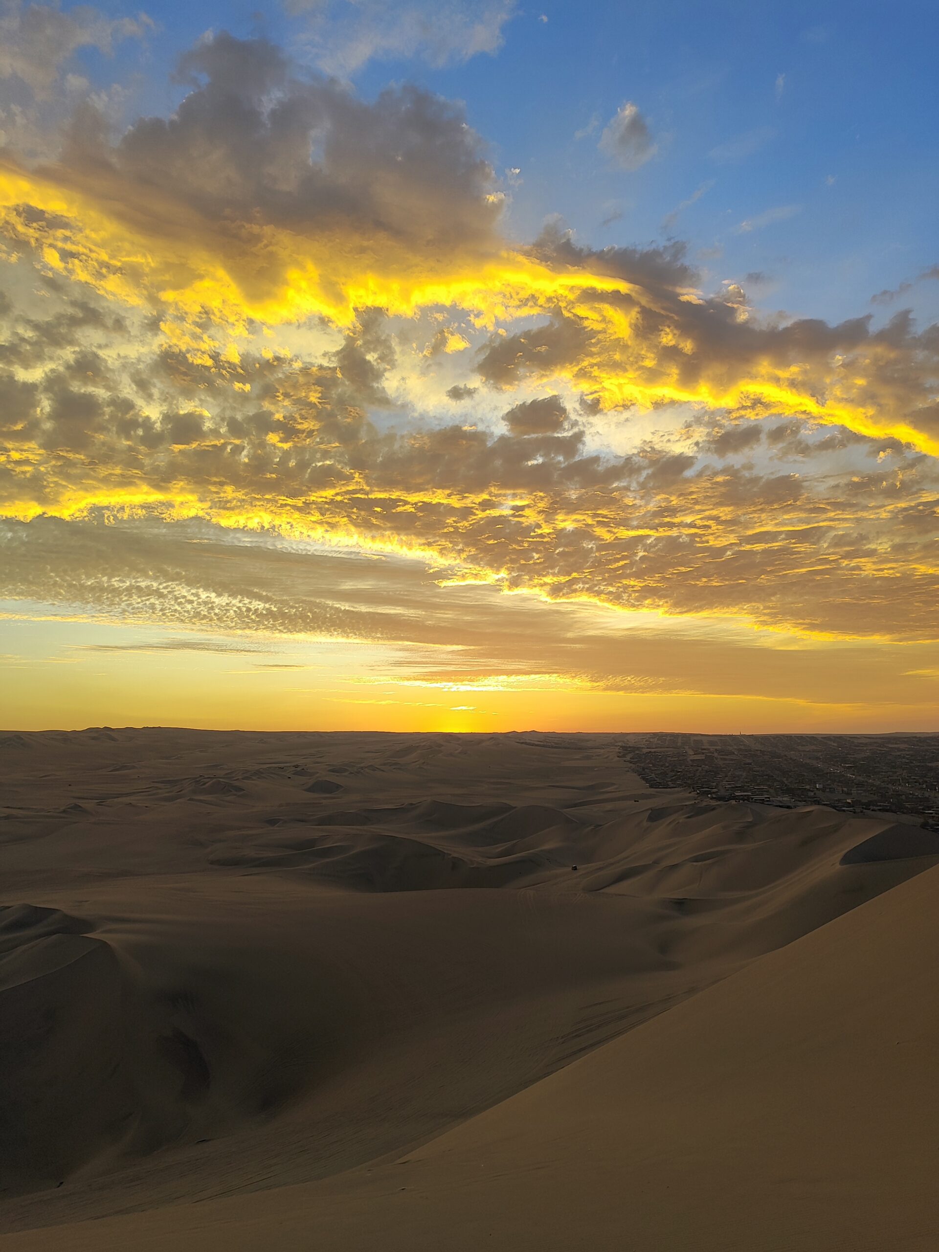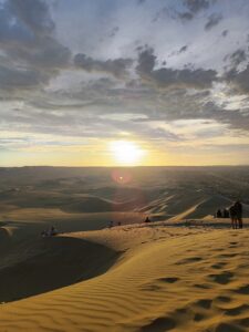 Es ist sehr voll und alle möchten uns eine Buggy-Tour verkaufen. Wir wollen allerdings selber auf die riesigen Sanddünen klettern. Es ist gar nicht so einfach, sich durch den feinen Sand zu kämpfen aber nach einiger Zeit erreichen wir die Kuppe einer großen Sanddüne und können den Ausblick von oben genießen. Weit und breit türmt sich Sand bis an den Horizont zum Ozean. Und in der Mitte liegt die kleine Oase. Wir machen es uns gemütlich und genießen einen wundervollen Sonnenuntergang. Alleine ist man hier auf jeden Fall nicht, aber die Kulisse ist trotzdem einmalig. Und der Weg runter macht deutlich mehr Spaß als hoch. Wann können wir schonmal über endlose Sanddünen rennen? Zum Abschluss des Tages gibt es noch eine leckere Pizza und dann geht es auch schon zum Hotel zurück. Der nächste Tag wird lang!