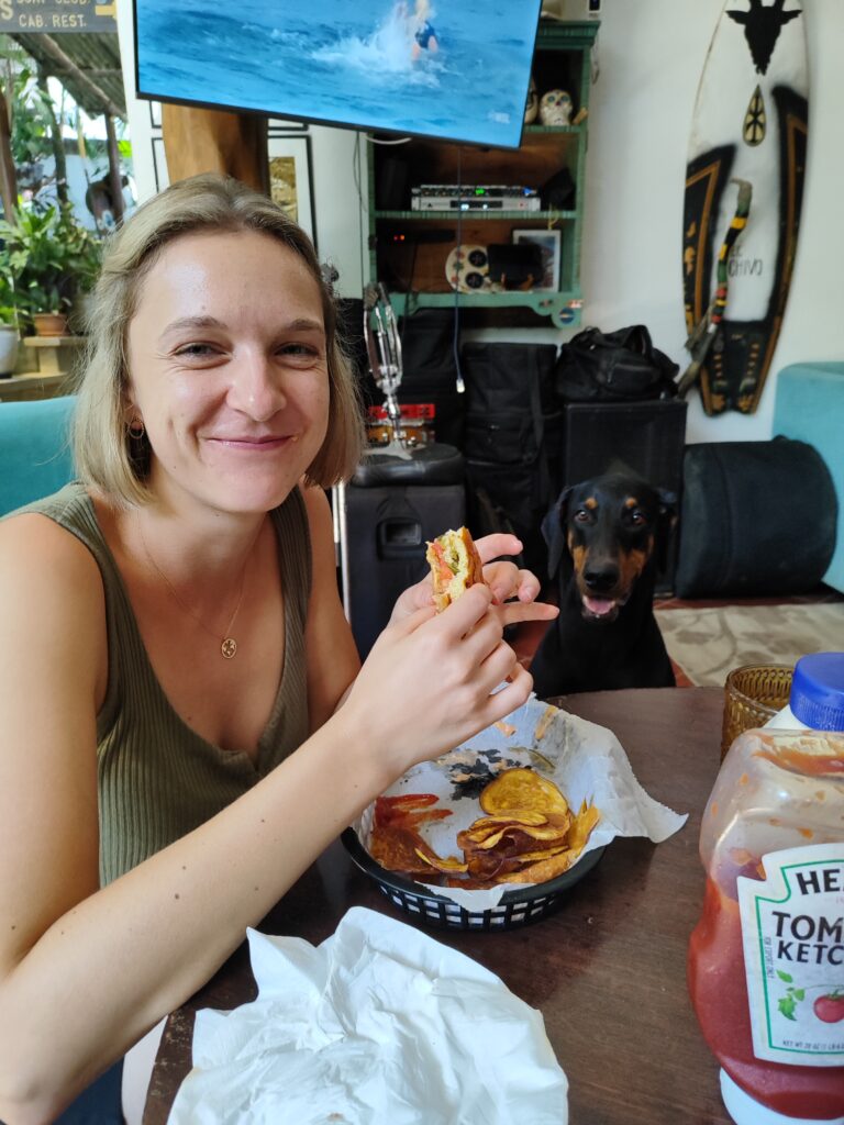 Kaum angekommen, sind wir dem Tipp unserer Gastgeberin gefolgt und direkt ins Restaurant gegenüber spaziert. Ergebnis: Leckere Burger und ein zuckersüßer Dobermann, der mit großen treuen Augen darum bettelte, ein paar Pommes abzubekommen. Wir konnten aber widerstehen und so ist er zum nächsten Gast getrottet. 😅
